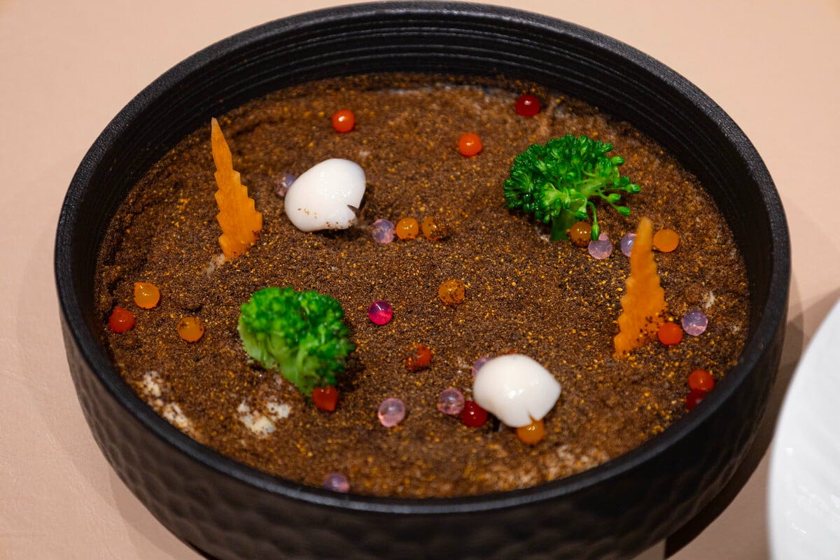 濃厚な味わいと柔らかな食感がたまらない「名物 豚バラ肉の甘辛煮込み」。「干し貝柱入りフワフワ卵蒸し(カニ風味)」は、卵を使った皇帝料理。「アボカド&ポテトのオリジナルサラダ」は、ココアと黒豆のパウダーを使い、日本の盆栽をイメージしています。北京ダッグと同じスタイルでいただく「甘辛豚肉の細切り炒め クレープ包み」。豚肉や野菜などバラエティに富んだ食材の味、食感がおいしさの決め手です。