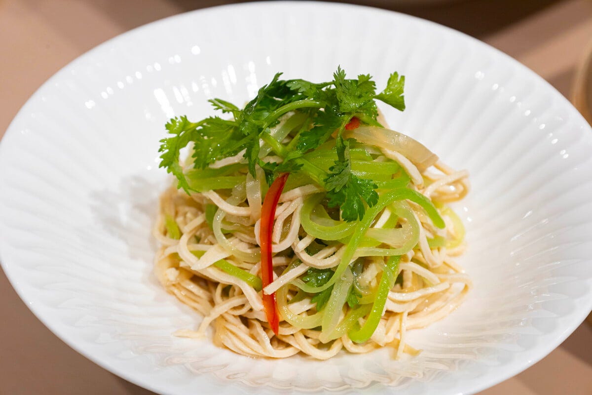 「千切り三種の中華和え」(680円) 大人気の「大根パイ」は、生地がサクサク。中の細切り大根は熱々でトロリとした食感が特徴で、いくらでも食べられそう。「千切り三種の中華和え」は湯葉と白きくらげ、茎レタスの食感がポイントです。