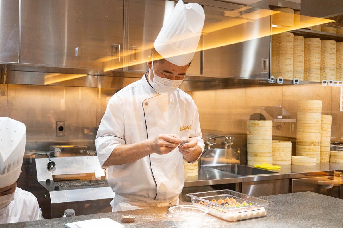 店内からは小籠包づくりの様子を眺めることもできます。 日本初出店ということもあり、点心長はパラダイスダイナスティ全体の副料理長が担当。さらに炒め料理を担う料理長をはじめ、本場シンガポールから12名のスタッフが来日しています。