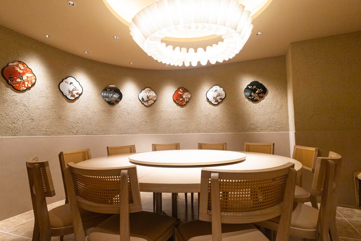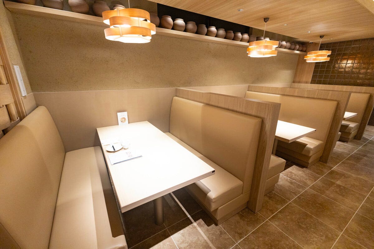 店内は木目を基調とした落ち着いた空間で、ゆったり過ごせる雰囲気。ハイバックソファのボックス席や円卓、回転テーブル付きの半個室など、さまざまなシーンに対応できる席が揃っています。