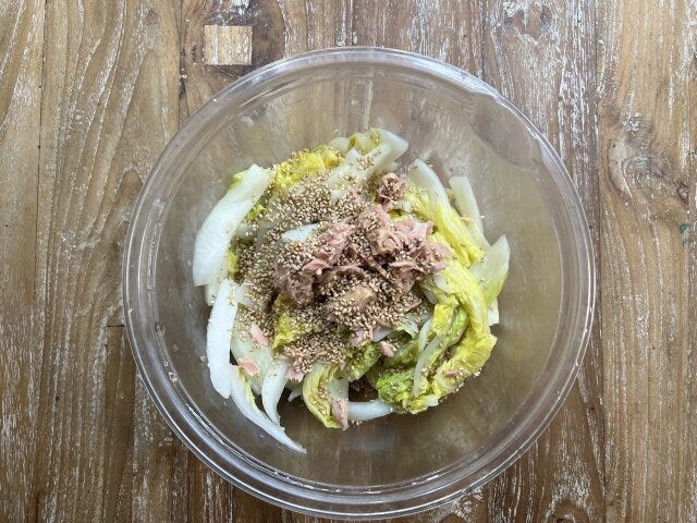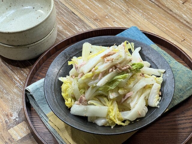 「これなら1個余裕で食べきれる!」レンチンして和えるだけ!白菜のツナポン酢サラダ