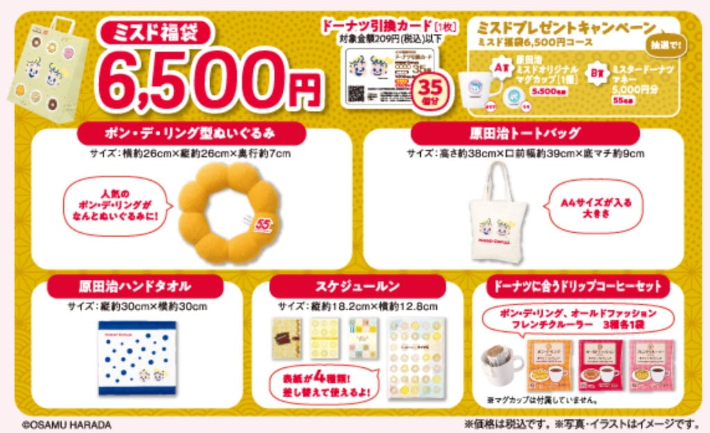 「ミスド福袋6,500円」 こちらの福袋は、まるで“ミスド好きの宝箱”! 、「ポン・デ・リング型ぬいぐるみ」「原田治トートバッグ」「原田治ハンドタオル」「スケジュールン」「ドーナツに合うドリップコーヒーセット」「ドーナツ引換カード(35個分)」など、特別感あふれるアイテムが勢ぞろい。