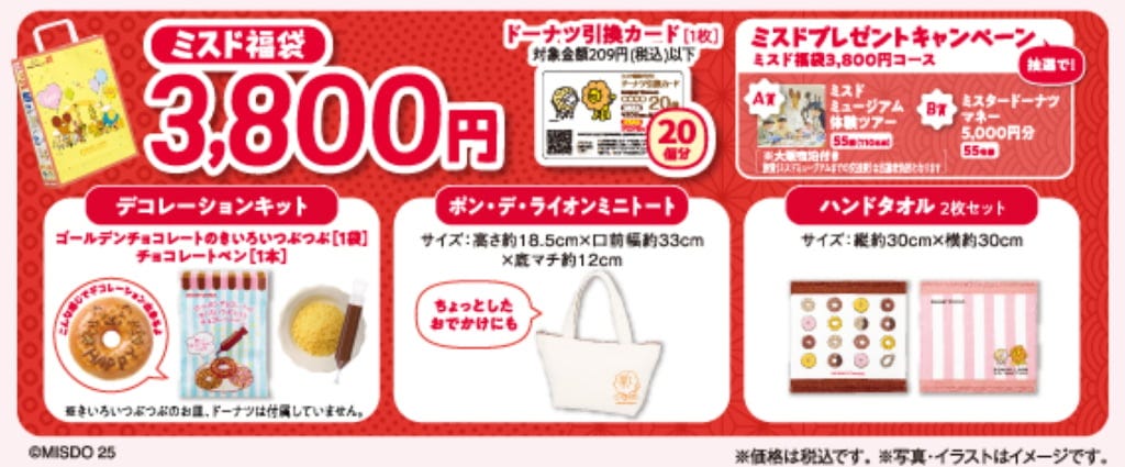 「ミスド福袋3,800円」 「デコレーションキット」「ポン・デ・ライオンミニトート」「ハンドタオル2枚セット」など、日常使いしやすいアイテムがたっぷり。さらに、「ドーナツ引換カード(20個分)」まで入った、お得感満載のセットです。