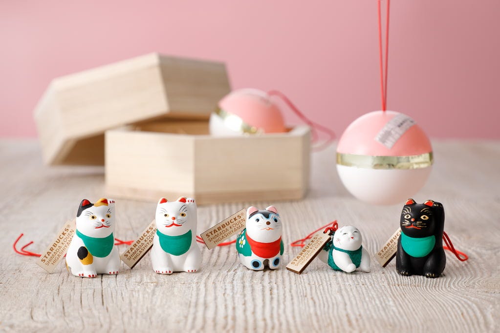 (左から)「縁起物チャーム招き猫土鈴ミケ」、「縁起物チャーム招き猫土鈴シロ」、「縁起物チャーム駒犬土鈴」、「御所人形チャーム這児(ハイコ)」、「縁起物チャーム招き猫土鈴クロ」 スターバックスが実施するJIMOTO Madeは、日本各地にあるその地元の産業、素材を取り入れた商品開発を行い、その地元の店舗のみで販売するシリーズ。京都・祇園の風物詩である福玉から着想を得て、伝統ある御所人形と組み合わせ、「縁起物チャーム」が誕生したそう。