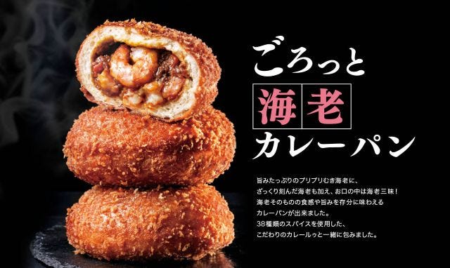 「ごろっと海老カレーパン」(1個/360円) うまみたっぷりのプリプリむきエビに、ざっくり刻んだエビを加えたエビづくし。エビ本来の食感やうまみを存分に味わえるカレーパンです。