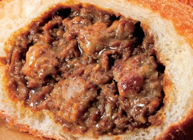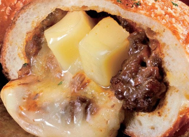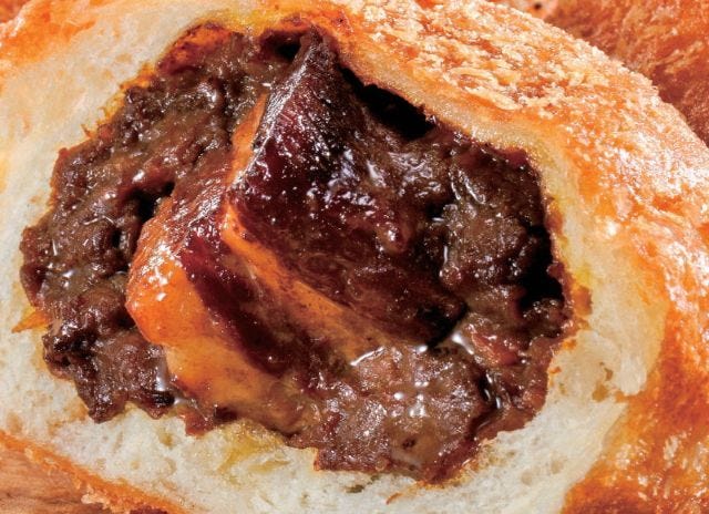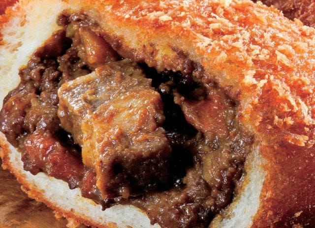 「王道ビーフカレーパン」(1個/330円) じゃがいも、人参、牛肉の「ごろっと」した食感が特徴のカレールゥと、ルゥに負けない「ごろっと」大きな牛角煮を包んだ、これぞ王道ビーフカレーパン。醤油ベースでじっくり煮込んだ大ぶりな牛角煮の、柔らかくてジューシーなうまみがたまりません。