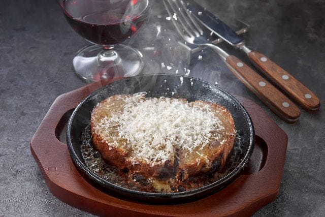 「いちじくとクルミのやみつきトースト」 神戸屋で人気のトゥルニュ(いちじくとクルミのパン)に、アンチョビとバター、はちみつをかけて焼き上げ、仕上げにたっぷりのパルミジャーノチーズを振りかけたひと品です。甘じょっぱさがまさに“やみつき”の「いちじくとクルミのやみつきトースト」。