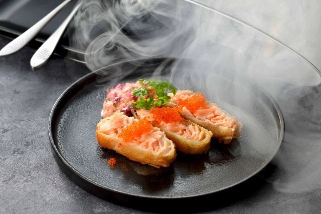「鳥取県産グランサーモンのレアカツ」 ほどよい脂とまろやかな味わいが特徴のグランサーモンをレアに仕上げたひと皿。提供時のスモーク演出にも注目です。