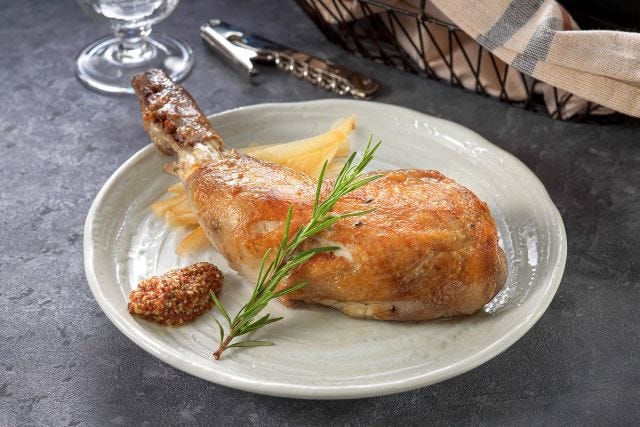 「大山どり骨付き鶏もも肉のコンフィ」 ハーブと塩で丁寧にマリネし、鶏のうまみを閉じ込めながら低温のオイルでゆっくり加熱。ホロっと骨から身が外れるほど柔らかい極上コンフィは必食です。