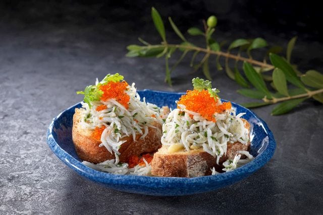「岸和田漁港の釜揚げしらすのこぼれブルスケッタ」 噛むほどにうまみが広がるカンパーニュに、こぼれんばかりの釜揚げしらすと、プチプチ食感が楽しいとびっこをトッピング。お酒が進むひと皿です。
