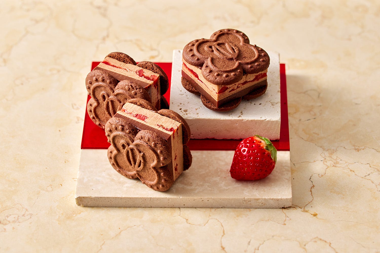 バタークリームとガナッシュがとろりと美味しい極厚バターサンドは、名古屋限定の毎年人気のバレンタイン定番商品!実の中まで赤く熟す”サンアンドレアス種苺”の果肉を苺のピューレで煮込んで仕立てた、苺本来の甘みと酸味を味わえる苺コンフィチュールジュレに、自家製のショコラホイップバタークリームを使用。とろけるように濃厚なガナッシュも一緒に、苺のジューシーな美味しさを贅沢な厚みのままココア香るクッキーではさんでおり、食感も楽しめる一品。