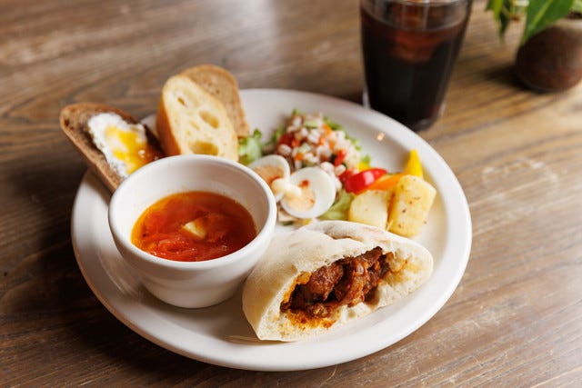 「ランチプレート(ドリンク付き)」1,650円/提供時間:平日11:30~、土・日・祝11:00~ 写真の「ランチプレート」は、黒こしょうがきいた爽やかな酸味が楽しめるラッサムスープ、なすびのカレーピタサンド、押し麦サラダ、じゃがいものソテー、3種のパン、そしてドリンクが付いた一番の人気メニューです。