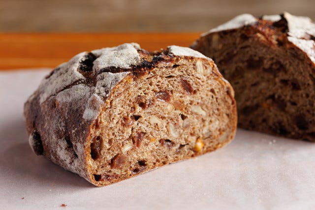 「メランジェ」ハーフ440円、ホール880円 有機ライ麦と小麦を合わせた生地に、クルミや有機いちじく、レーズン、オレンジピールがたっぷり入った「メランジェ」は、どっしりとボリューム満点。自家製の天然酵母を使い、もっちりと食べ応え満点の一品に仕上がっています。