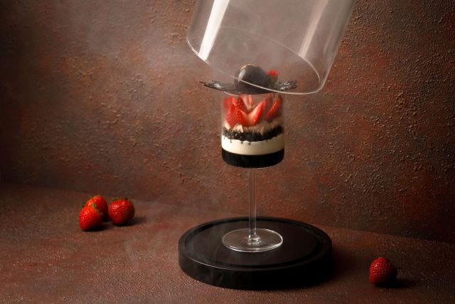 廃材になった南高梅の木を燻製チップとして使用。香ばしい香りがパフェ全体を包み込みます。グラスの中には紀州備長炭でローストしたほろ苦いコーヒーゼリーやまろやかなマスカルポーネ、パールクラッカーなどが。上から温かいカフェエッセンスソースをかけることで、パフェ全体に深みとコクをプラス。五感で楽しむ大人のスイーツを堪能できます。