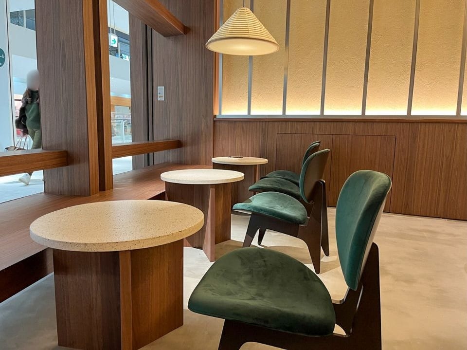 吹き抜けに面した場所にある明るい店内は、落ち着いた色調のインテリアでまとめられ、オープンな空間でありながらも落ち着いた雰囲気です。友人とおしゃべりしたり、ひとりでゆっくり過ごしたり、思い思いの時間が過ごせそう。