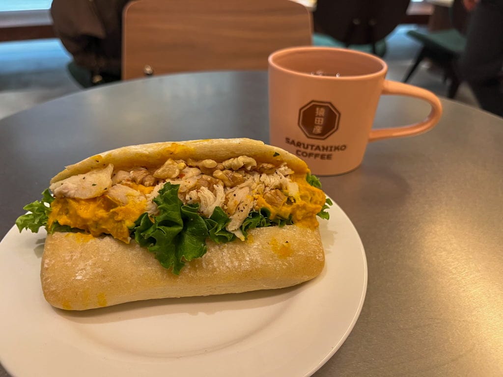 「蒸し鶏とメープルパンプキンのサンドイッチ」(700円/テイクアウト687円) 「蒸し鶏とメープルパンプキンのサンドイッチ」は、しっとりやわらかな蒸し鶏に、やさしい甘さのメープルシュガーとブレンドしたハーブ、かぼちゃのペーストが合わさって、塩味と甘みのバランスが絶妙。ランチはもちろん、ブランチや小腹が空いたときにもぴったりのサンドイッチです。