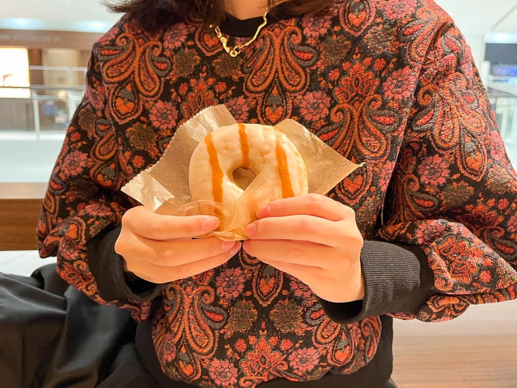 「キャラメルドーナッツ」(300円/テイクアウト294円) スイーツはどれもコーヒーとの相性を大切に、甘さを抑えています。見た目にもかわいい「キャラメルドーナッツ」はふんわり軽くて、生地の中にもキャラメルソースが入っています。甘さ控えめなので、甘いものが少しだけ欲しいときにもぴったり。