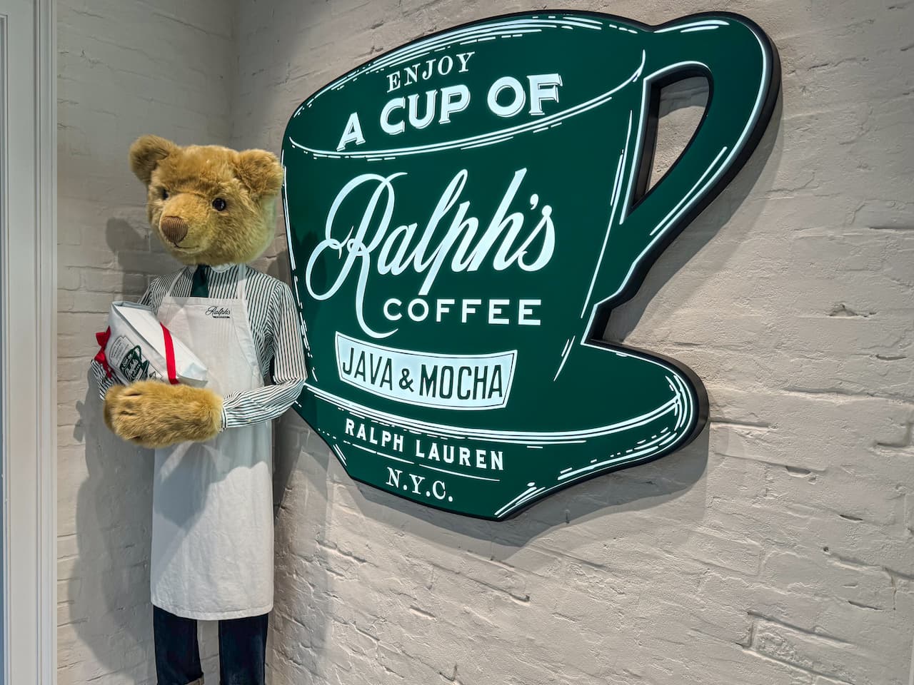 「ポロ ラルフ ローレン 心斎橋」に併設された「Ralph’s Coffee(ラルフズコーヒー)」は、白とグリーンを基調とした洗練された空間も魅力のカフェです。ここでぜひオーダーしたいのが、眺めるだけで笑顔になるクマちゃんのラテアートが描かれた「ラテ」。店員さんに「クマのラテアートでお願いします」と伝えると、思わず写真におさめたくなる一杯に。さらにかわいさをプラスしたい方は、「ポロベアクッキー」を添えるのもおすすめです。