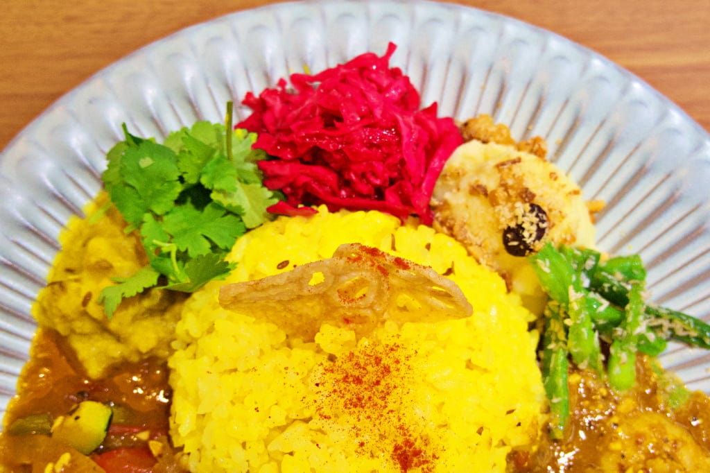 色とりどりの副菜も乗っていて、左から、チャナマサラ(ひよこ豆のカレー仕立て)、パクチー、紫キャベツとビーツのラペ、ココナッツマッシュ、インゲンのトーレン、さらに、ライスの上にはレンコンチップが。6種の副菜とスパイスカレーを少しずつ混ぜながら食べると、味わいが変化し、まさに異国! 最後は全部混ぜて堪能するのがおすすめです。