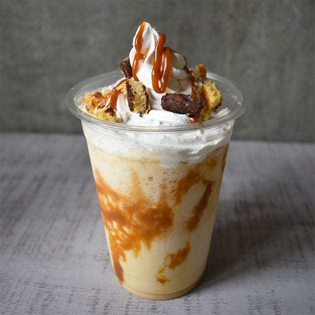 ビスキュイトゥリー・サンゲノレ「ガレット・塩キャラメルフラッペ」(895円)<ジェイアール京都伊勢丹限定> 「ピエール・エルメ・パリ」からはチョコレートづくしのフラッペが、「ビスキュイトゥリー・サンゲノレ」からはほろ苦い塩キャラメルとコクのある甘さが溶け合うフラッペが登場。ここだけの味わいを、会場で確かめて。