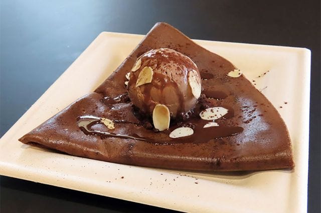 「ラヴニュー ビス」では、キャラメル×ショコラの熱冷スイーツを提供。パティスリーならではのクレープショコラキャラメルに、クレームグラッセショコラとチョコレートソースをトッピングしています。