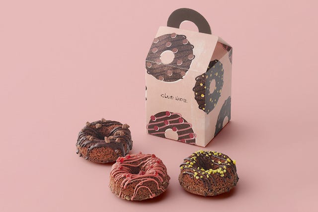 「チョコ部開発商品 クラブハリエのWA」 新作「チョコ部開発商品 クラブハリエのWA」は、インスタライブ「チョコ部」にて、ショコラティエとお客様が共同で開発した商品♡ チョコ感たっぷり、POPにデコレーションした3種の味わいの焼きドーナツで、ショコラティエが生地の食感やチョコレートにこだわっています。