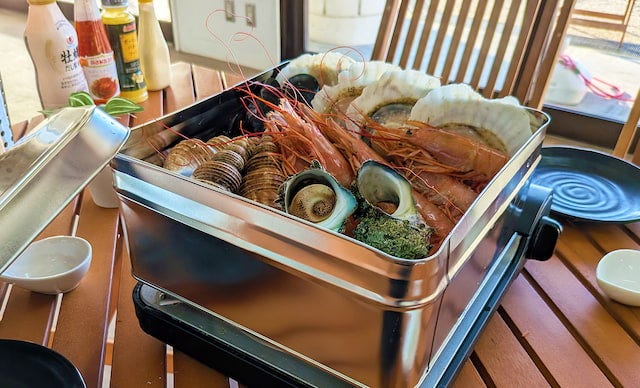 「海鮮ガンガン焼き」 ※写真は牡蠣無しのガンガン焼きセット また今年は、新メニューとして「海鮮ガンガン焼き」も登場! 牡蠣に加えて、エビやホタテなどの海鮮を豪快に蒸し上げた一品で、満足度の高い食体験が楽しめます。牡蠣も海鮮もどちらも食べたい…という欲張りな気分の日にもぴったりです。
