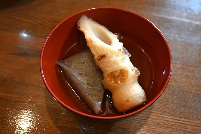 目玉の養殖本マグロは、脂がのっていて口当たりはなめらか。おすすめされた刺身醤油をかけると、まろやかな甘みが刺身のおいしさを引き立ててくれました。魚のうまみが詰まったあら汁と一緒に楽しむと、満足感もさらにアップします。