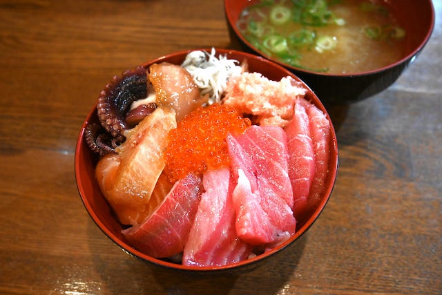 「漁港食堂」でぜひ試したいのが、刺身を好きなだけのせて作る“オリジナル海鮮丼”。