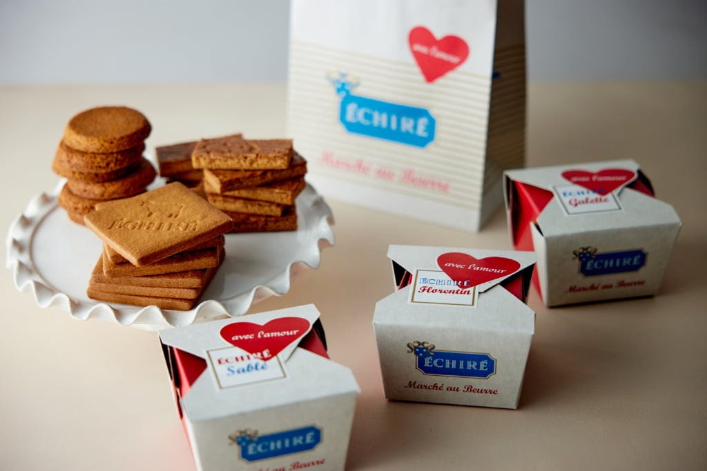 「サブレ・エシレ(6枚入)」、「ガレット・エシレ(6枚入)」、「フロランタン(8枚入)」(各1,944円) また、3月中旬までのバレンタイン&ホワイトデー期間は、「サブレ・エシレ(6枚入)」「ガレット・エシレ(6枚入)」「フロランタン(8枚入)」を、赤いハートのモチーフに「avec l’amour」のメッセージを添えた限定デザインのボックスで販売。ショッパーにも同様のデザインを施しています。