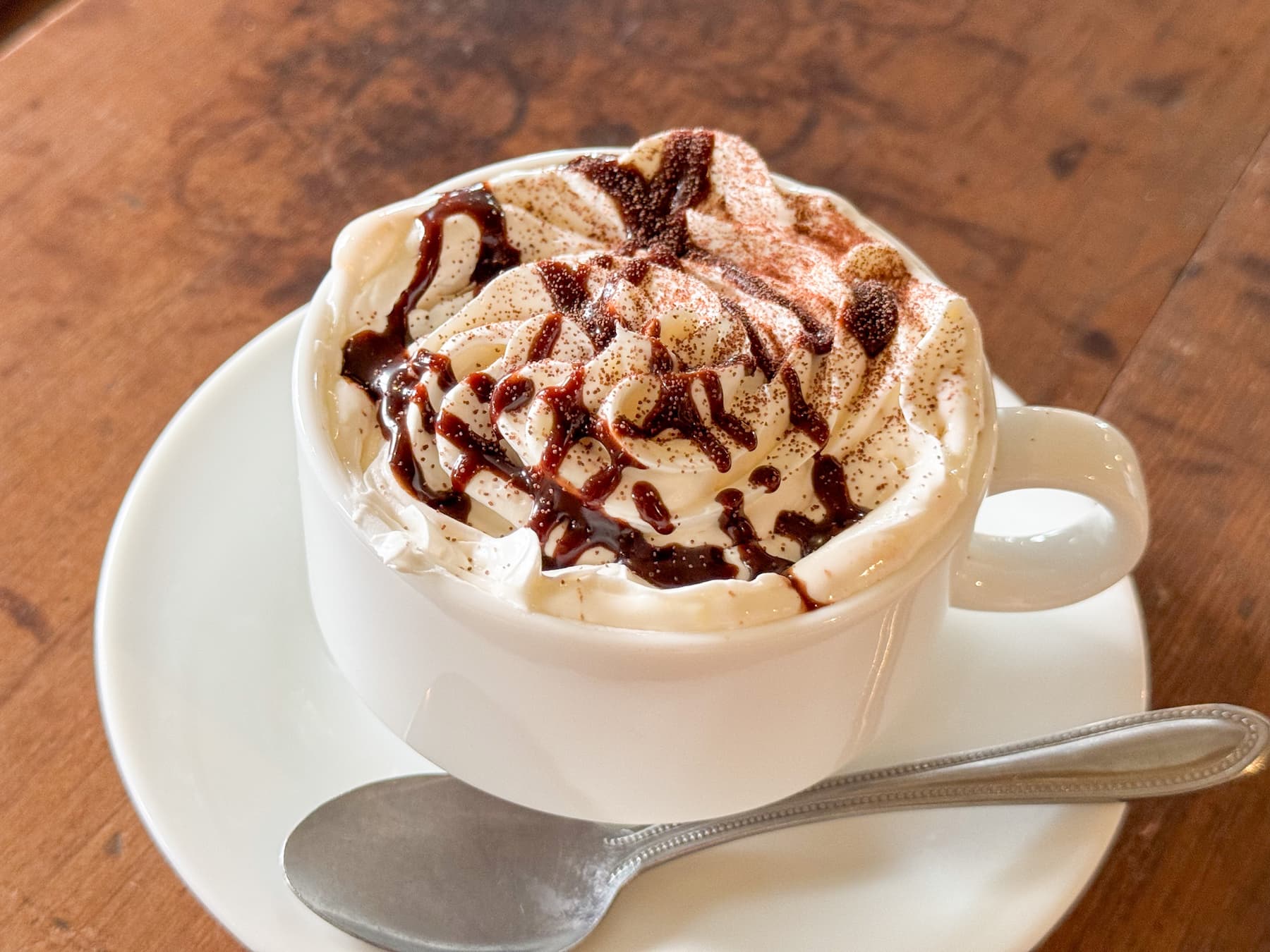 「ホットカフェモカ」770円 ※ケーキとセットで150円オフ この日は甘いものをゆっくり楽しみたくて、ドリンクには「ホットカフェモカ」をセレクト。