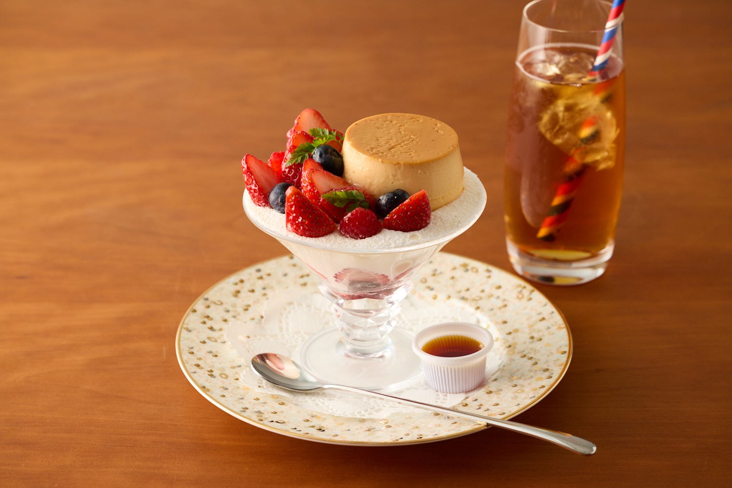 なめらかでコクのある自家製プリンに、彩り豊かなフルーツとクリームを華やかに盛り付けた贅沢なデザート。フルーツは季節ごとに内容が変わり、その時期いちばん美味しい味わいを楽しめるのも魅力。ほどよい甘さのカラメルとプリンのやさしい口どけ、みずみずしい果実の組み合わせが、最後のひと口まで心地よい一品。※季節によって使用されるフルーツが異なります。