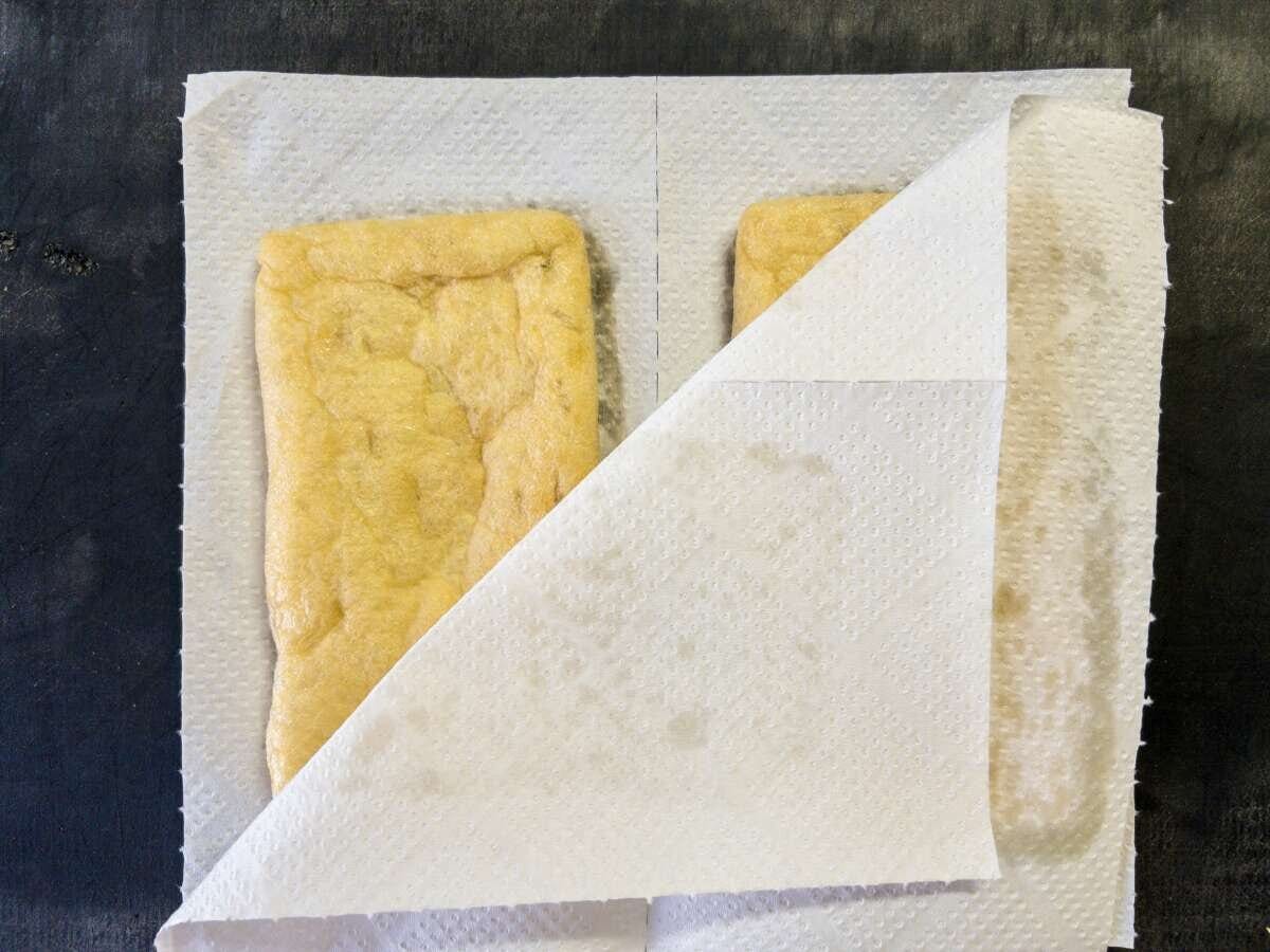 ③ 油揚げはキッチンペーパーに挟んで油抜きをしてから、半分にカットします。
