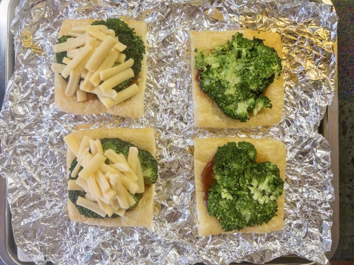 作り方はとっても簡単!油抜きをした油揚げを半分にカットして、ケチャップを塗って、茹でたブロッコリー、シュレッドチーズを順に乗せ、トースターで焼くだけ。