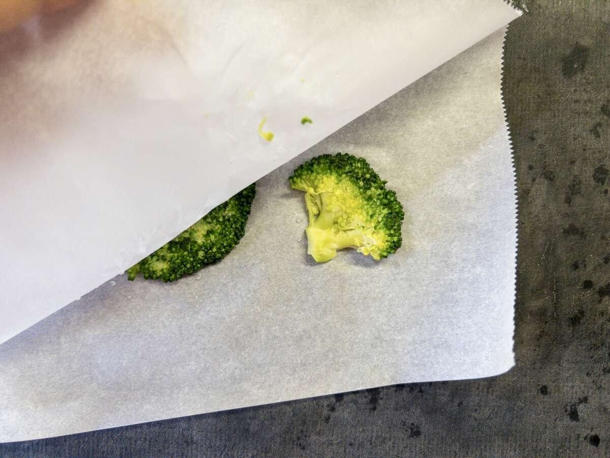 ② ブロッコリーをクッキングシートに挟み、上から圧をかけて軽く潰しておきます。