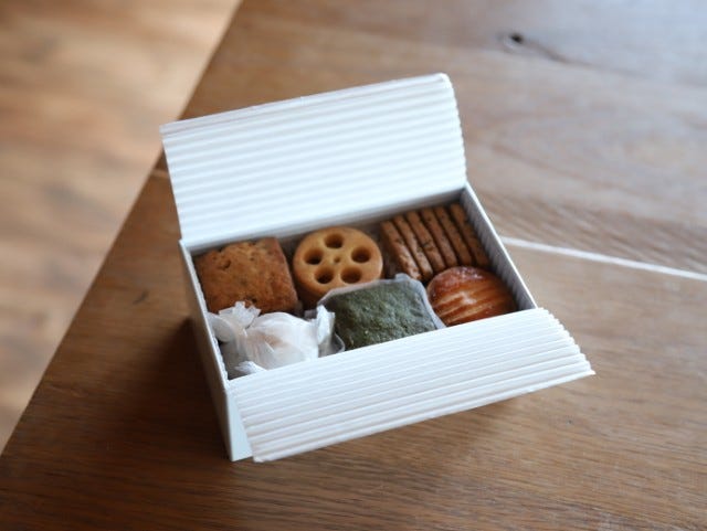 缶のなかには、山崎にある国宝「待庵」や、かつて油座文化が栄えた離宮八幡宮にちなんで宇治抹茶と荏胡麻(えごま)を使った焼き菓子がイン。ストアのロゴでもあるレンコン型のクッキーが見た目にも楽しく、厳選素材でていねいに焼き上げています。