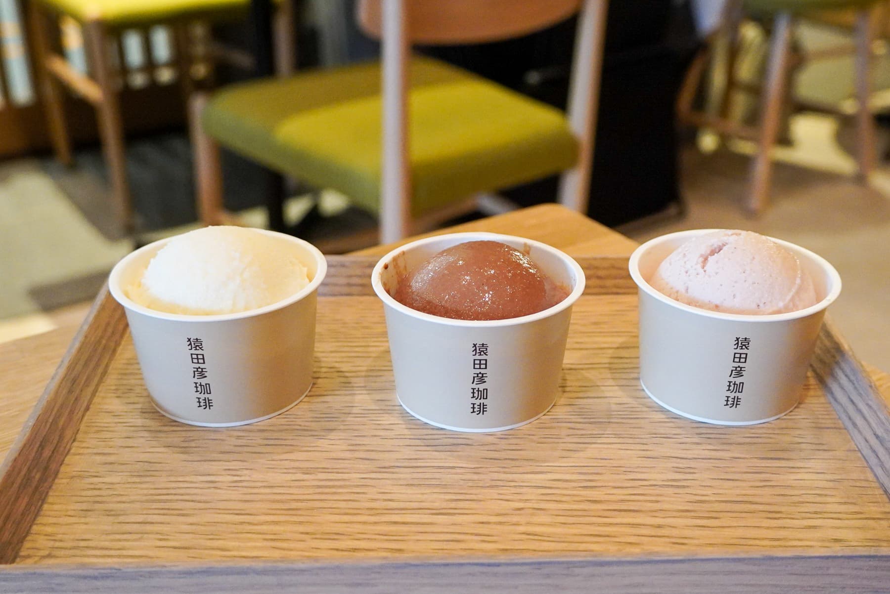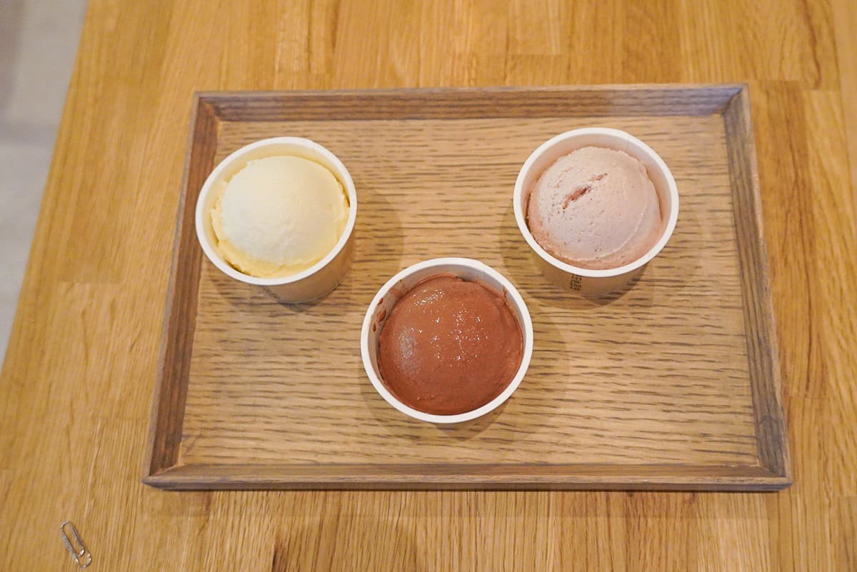 京都祗園店限定のアイスクリームは、和テイストが光る3フレーバー。「和三盆みるく」は、和三盆糖ならではのやさしい甘さが特長。「山椒とチョコレート」は、カカオ分の高いチョコレートに、華やかな山椒の香りを効かせた大人の味。「ニッキと木苺」は、甘酸っぱい木苺に、ニッキのやわらかな香りが余韻として残ります。どれも甘さ控えめで個性のある味わいで、コーヒーと一緒に、季節を問わず楽しみたいデザートです。他にも京都の「柳桜園茶舗」の抹茶を使った「抹茶ショット」や、京菓子司「末富」の和菓子もラインナップ。