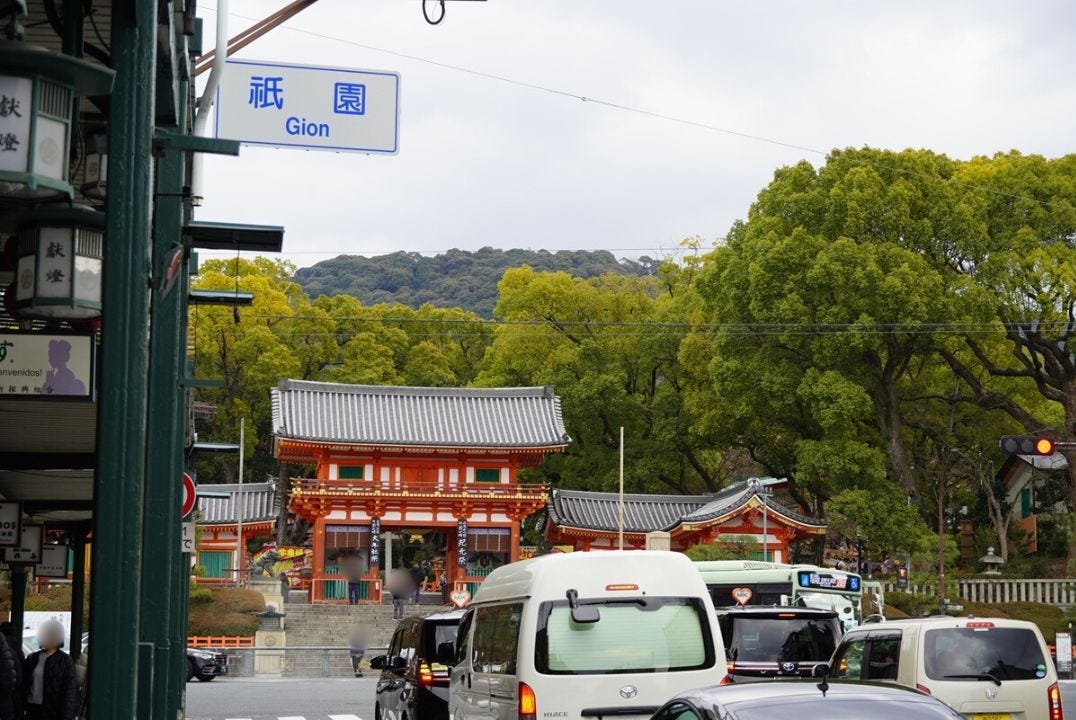 「猿田彦珈琲 京都 祗園」がオープンしたのは、八坂神社の石段下からすぐ。四条通の南側、漢字ミュージアムの1階にあります。お店の目の前にはバス停もあり、移動前にひと息つくのにもぴったりです。