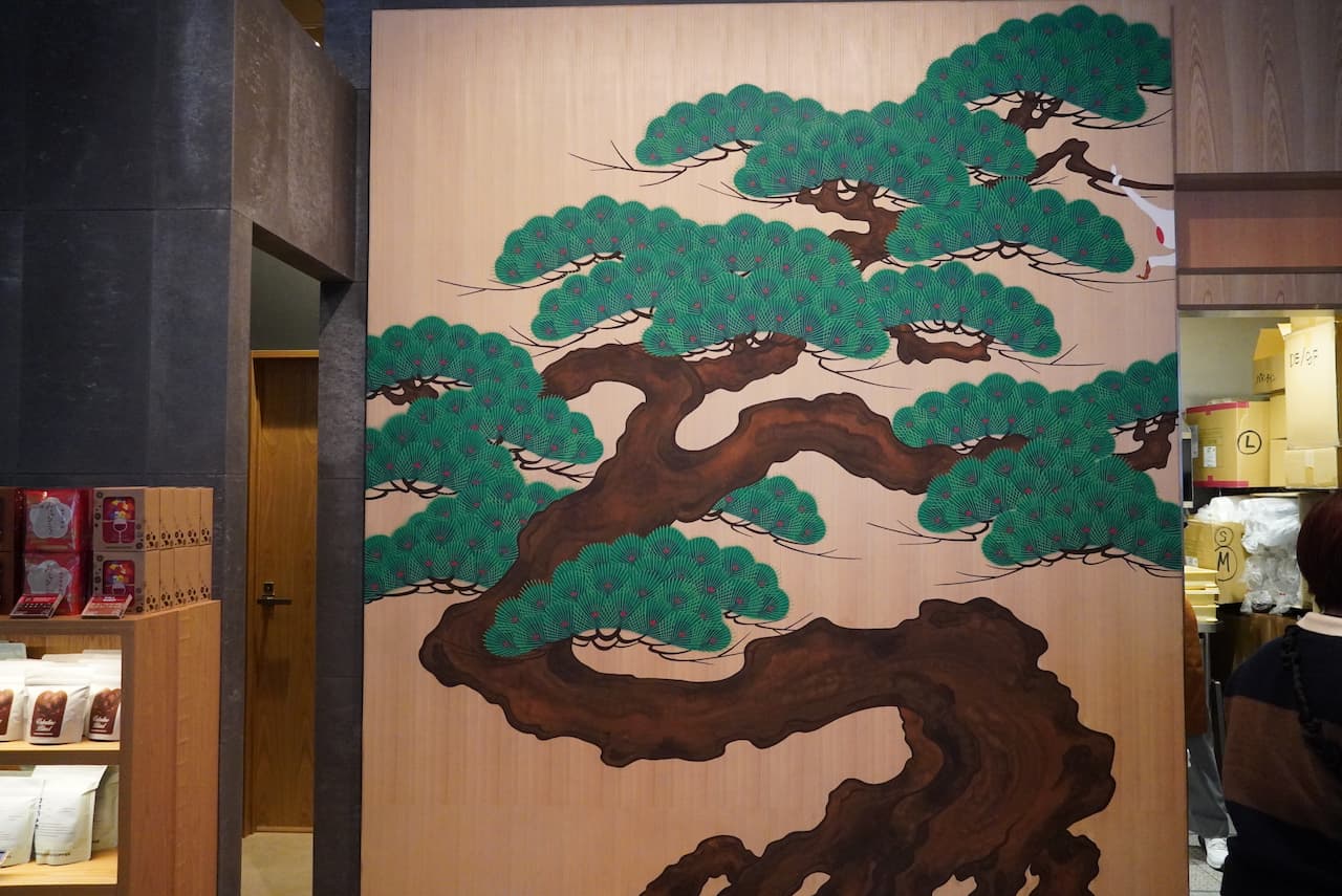 壁に飾られた松の絵にも注目! 日本庭園の大家・小川治兵衞氏の監修のもと、西陣織のデザイナー・浜松浩之氏が手がけた特別な作品です。曲がりくねった幹は、「猿田彦珈琲」代表・大塚朝之氏の紆余曲折の人生を表現。あえて描かれていない枝の先には、「これからも未来へ続いていく」という希望の意味が込められているそうです。