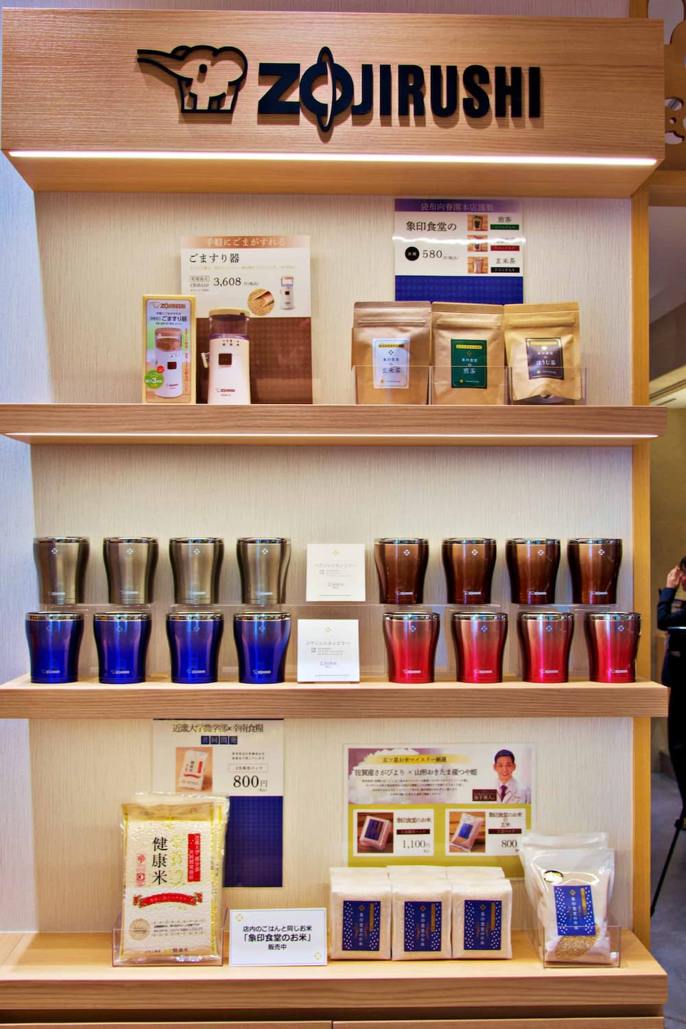店頭には象印ならではの物販コーナーも。保温・保冷力に優れたステンレスタンブラー、店内で提供している五つ星お米マイスターが厳選したお米、「袋布向春園」のお茶など、普段の生活をちょっと豊かにしてくれる商品が揃っています。物販の購入だけでも利用できるので、ぜひ覗いてみてくださいね。