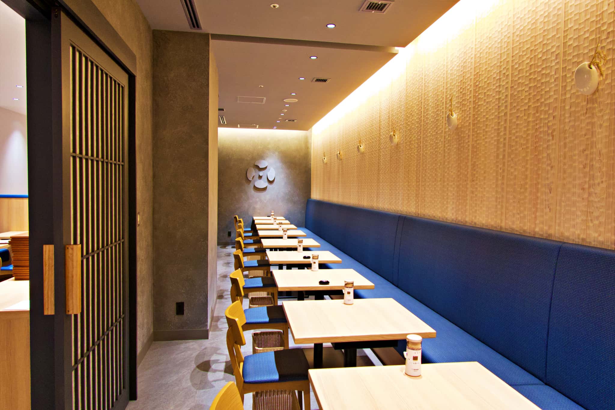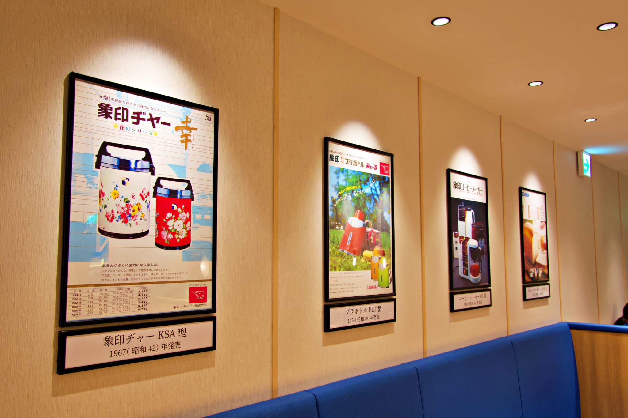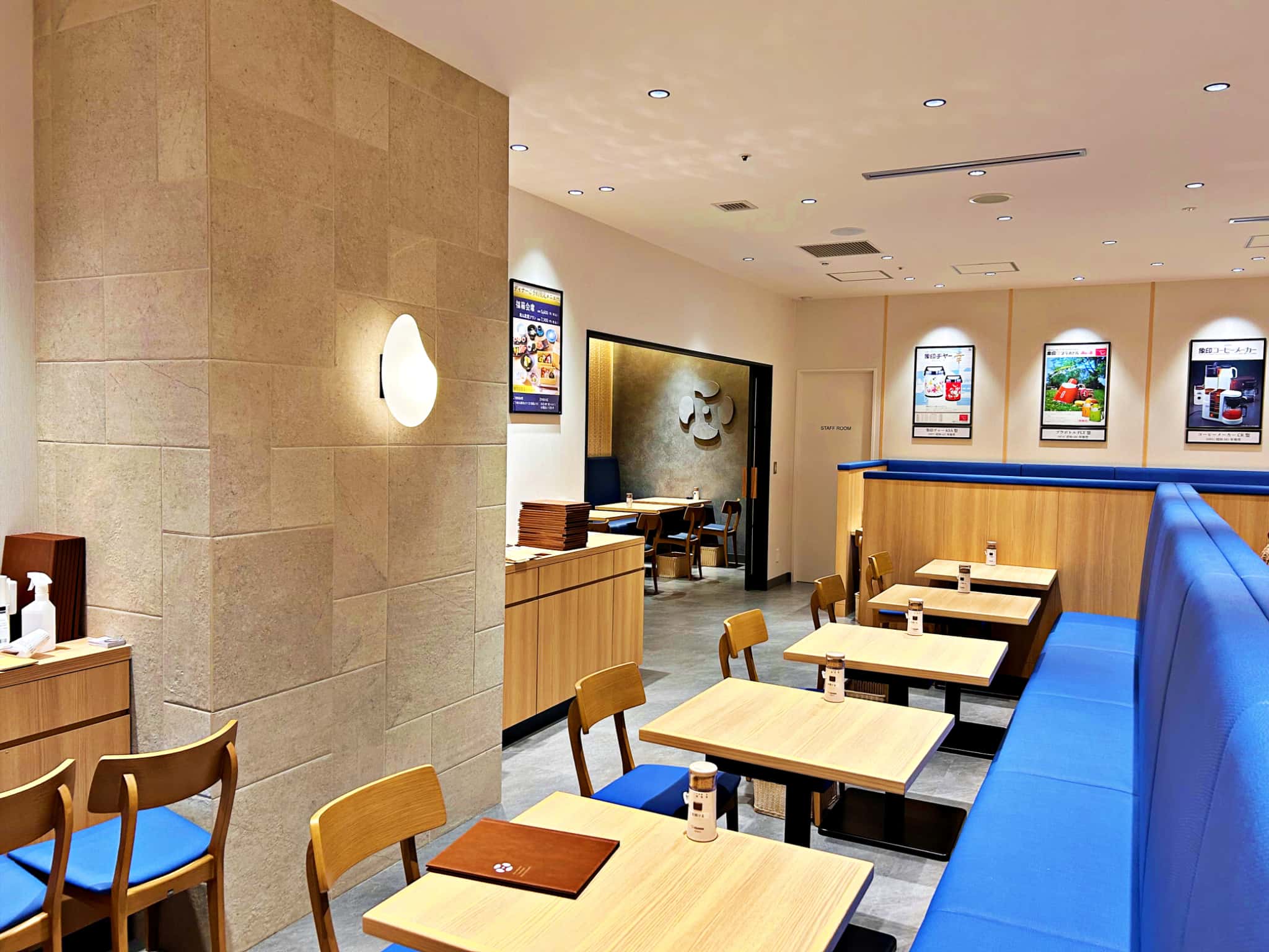 青を基調としたソファー席が並ぶ広々とした店内は、居心地の良さが抜群! お米をかたどった照明や懐かしい象印商品のポスターが飾られていたり、ところどころに見られる遊び心も素敵。特にポスターは、「実家にあったあった!」と会話が盛り上がります。