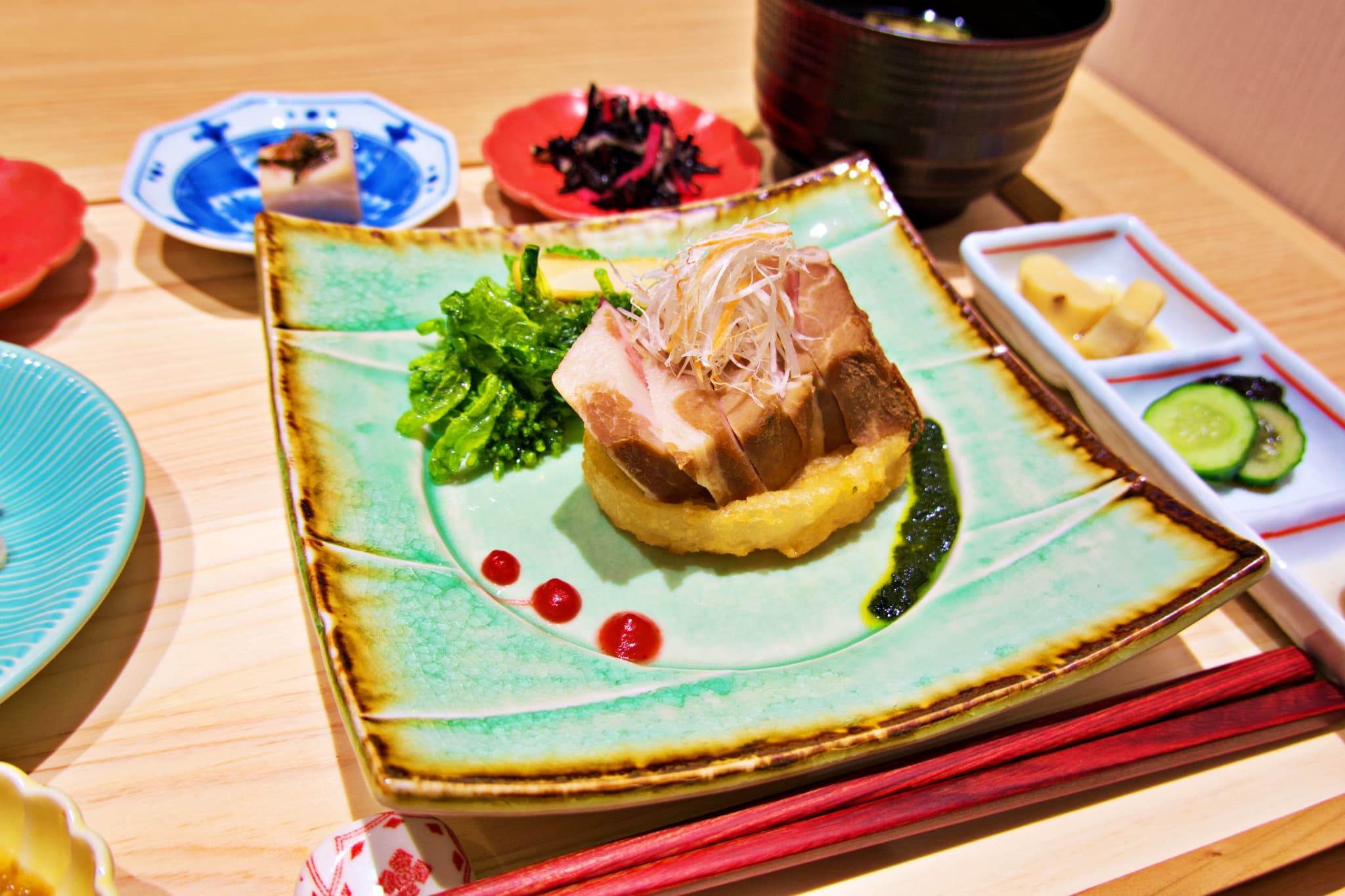 ディナーの「福箱会席」は、象印のオーブンレンジ「エブリノ」で調理した焼き豚を使用した料理、季節の恵みを忍ばせた玉手箱に、黒毛和牛のステーキと和牛ローストビーフなど、ぜいを尽くしたメニューになっています。ランチでは、同じく玉手箱に揚げたての天ぷら5種が付く「玉手箱会席」(4,200円、前日までに要予約)も。「福箱会席」も「玉手箱会席」も、季節が感じられる食材・料理が詰め込まれてあって、心ときめく、大人のための食時間が楽しめます。
