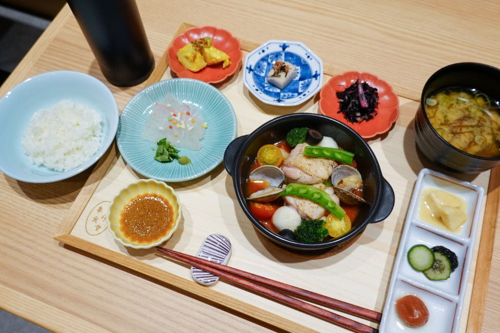 気になるメニューは、予約なしで楽しめる「象印御膳(鯛茶漬け付き)」が人気。メインは「鶏肉と魚介のトマトアクアパッツァ」、「四元豚のやわらか角煮」が選べ、小鉢には真鯛の薄造り、おかず豆皿3種、こだわりのごはんのお供などが並びます。ごはんの味を引き立てる風味に仕上げ、さらにどれも味付けを変えることで最後まで飽きないように工夫されています。