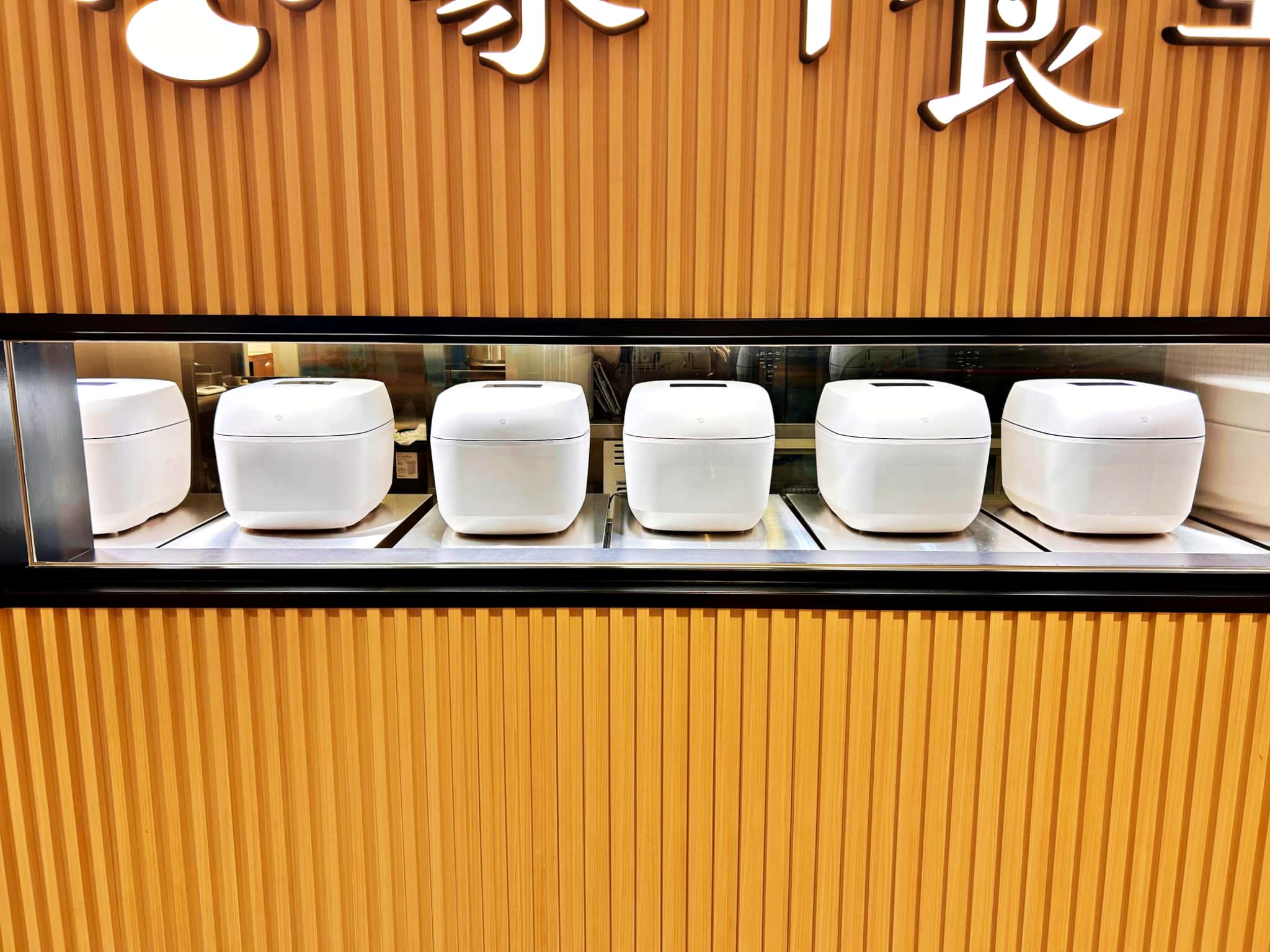 和のしつらえが高級感漂う入口には、「炎舞炊き」がずらり。ほか2店舗でも並んでいるのですが、ホワイトの「炎舞炊き」が入口に並ぶのは梅田店だけ。