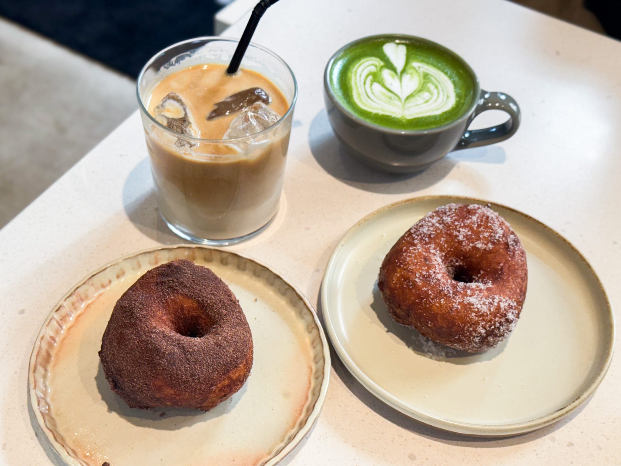 (手前左から)「マラサダ」(ココア/シュガー)各350円 ※完売次第終了、翌朝7:00~再度販売 (奥左から)「カフェラテ」650円、「抹茶ラテ」700円