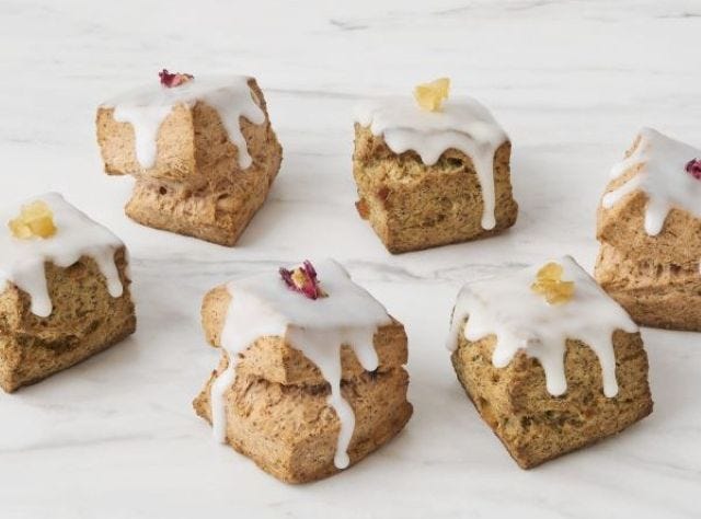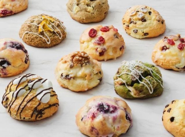 左から「ハワイアンスコーン」(432円~)、「イングリッシュスコーン」(378円~) 北海道産クリームチーズとフルーツなどがゴロゴロ入った新感覚の「ハワイアンスコーン」や、アールグレイにぴったりの「イングリッシュスコーン」など、外はサクッと中はフワフワの焼きたてスコーンの販売もあります。