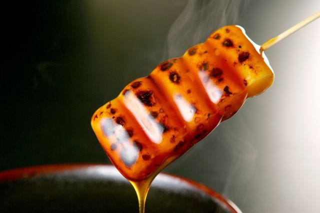 「コゲ少なめ」「コゲ普通」「コゲ多め」まで、焼き加減を選ぶことができます リニューアルオープンする「喜八洲総本舗」の人気商品といえば「みたらし団子」。注文を受けてから直火で炙る香ばしい団子に、上質昆布とたまり醤油、白ざら糖で作る特製タレを絡めたとっておきの味わいを、イートインスペースでいただけます。