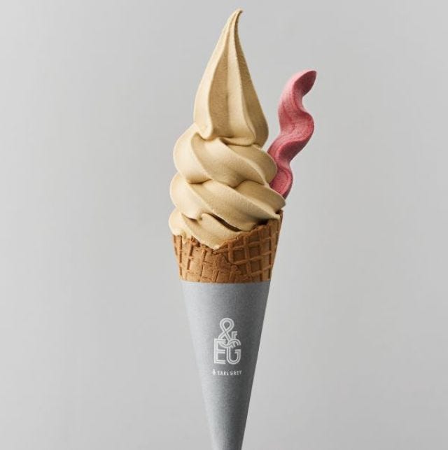 左から「アールグレイリッチミルク」(648円)、「バタフライピーアールグレイ」(648円) 人気の「ソフトクリーム」は、一口食べると口の中に爽やかなアールグレイの香りが広がり、自家製のメレンゲを添えてビジュアルにもこだわった一品です。