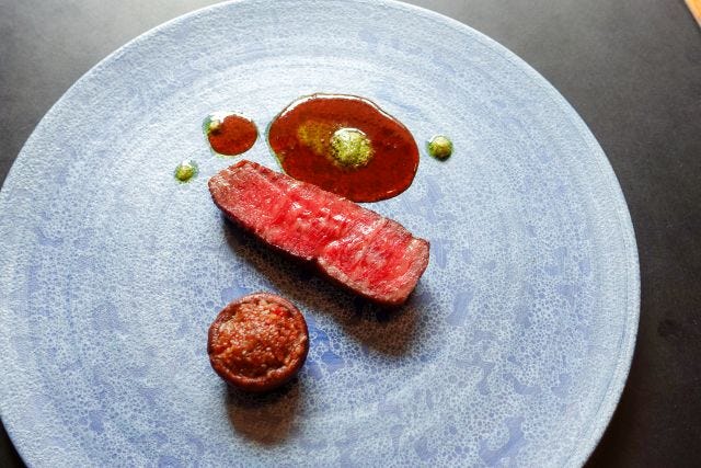 「コラボコース」より「しまね和牛 山椒」 ディナーの「コラボコース」は、品数豊富な贅沢メニュー。鈴木さんプロデュースの「帆立貝柱 大麦 九条ネギ」「カチュッコ」「リガトーニ 三田ポーク トマト」に加え、「香住ガニ」「ブッラータ 卵黄 山葵」「お野菜」「しまね和牛 山椒」「古都華 黒胡麻」、パンや飲み物がセットに。お祝いや記念日、大切な人との会食におすすめです。