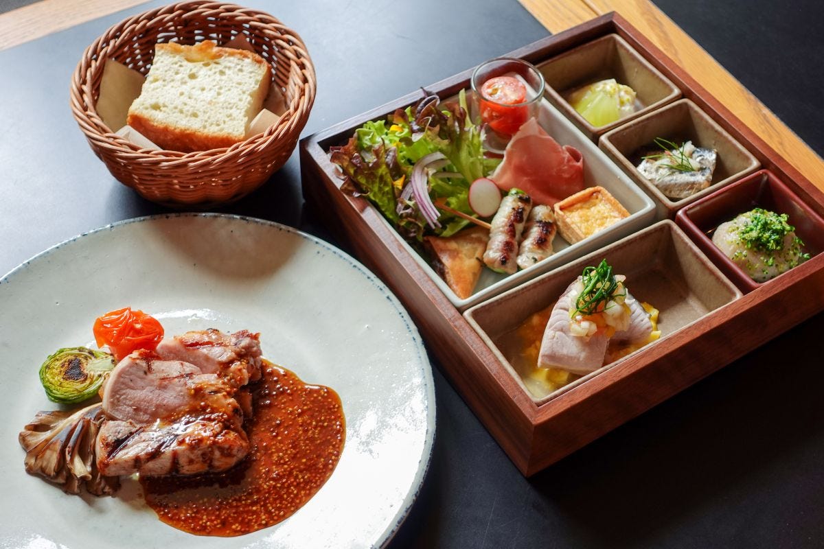 「箱前菜コース」4,700円 ※前日17:00までに要予約(1人~)。写真のメイン料理は「豚肩肉のグリル」 ランチの「箱前菜コース」は、春の集いにぴったりなごちそうメニュー。